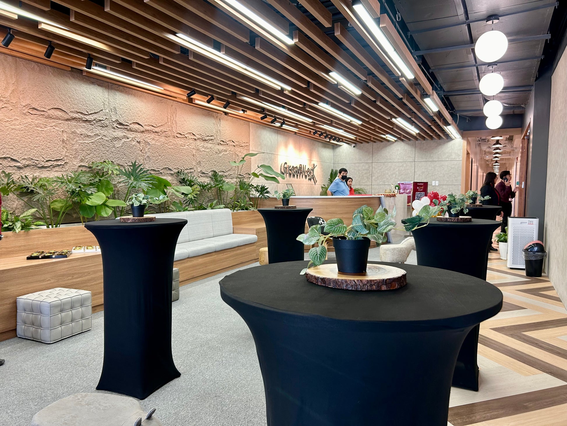 This sleek, waist-high Cocktail Table is perfect for standing mixers while enjoying the treats from Goodness Graze's grazing table, encouraging guest movement and social interaction.